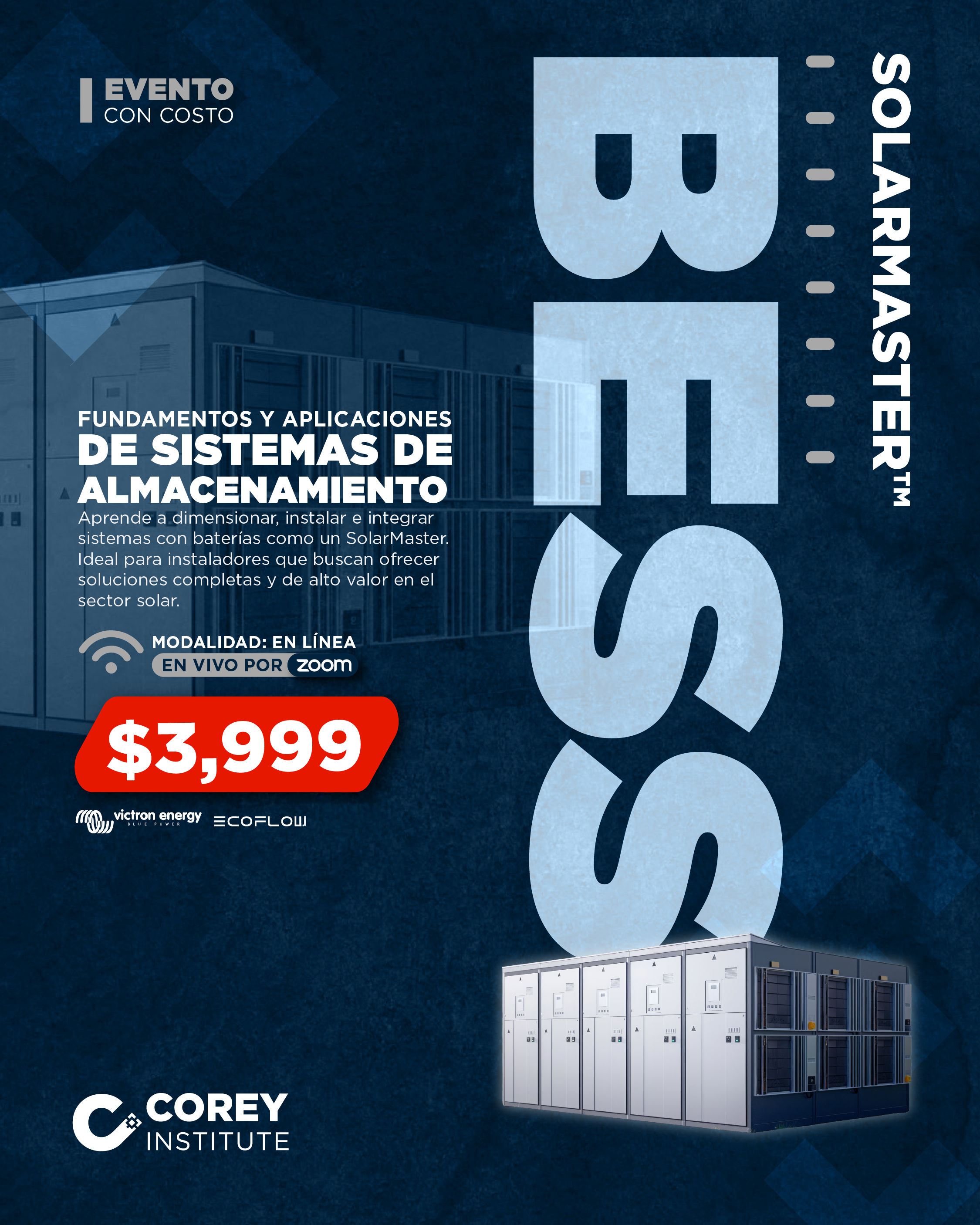 🎓 Constancia oficial de participación 📁 Material digital descargable 📹 Acceso a sesiones grabadas en Corey Institute 🧮 Calculadora HV y LV de dimensionamiento 📄 Lista de precios actualizada de equipos BESS 📱 Acceso a grupo privado de WhatsApp para resolver dudas → Te llevas herramientas reales para vender más desde día uno.