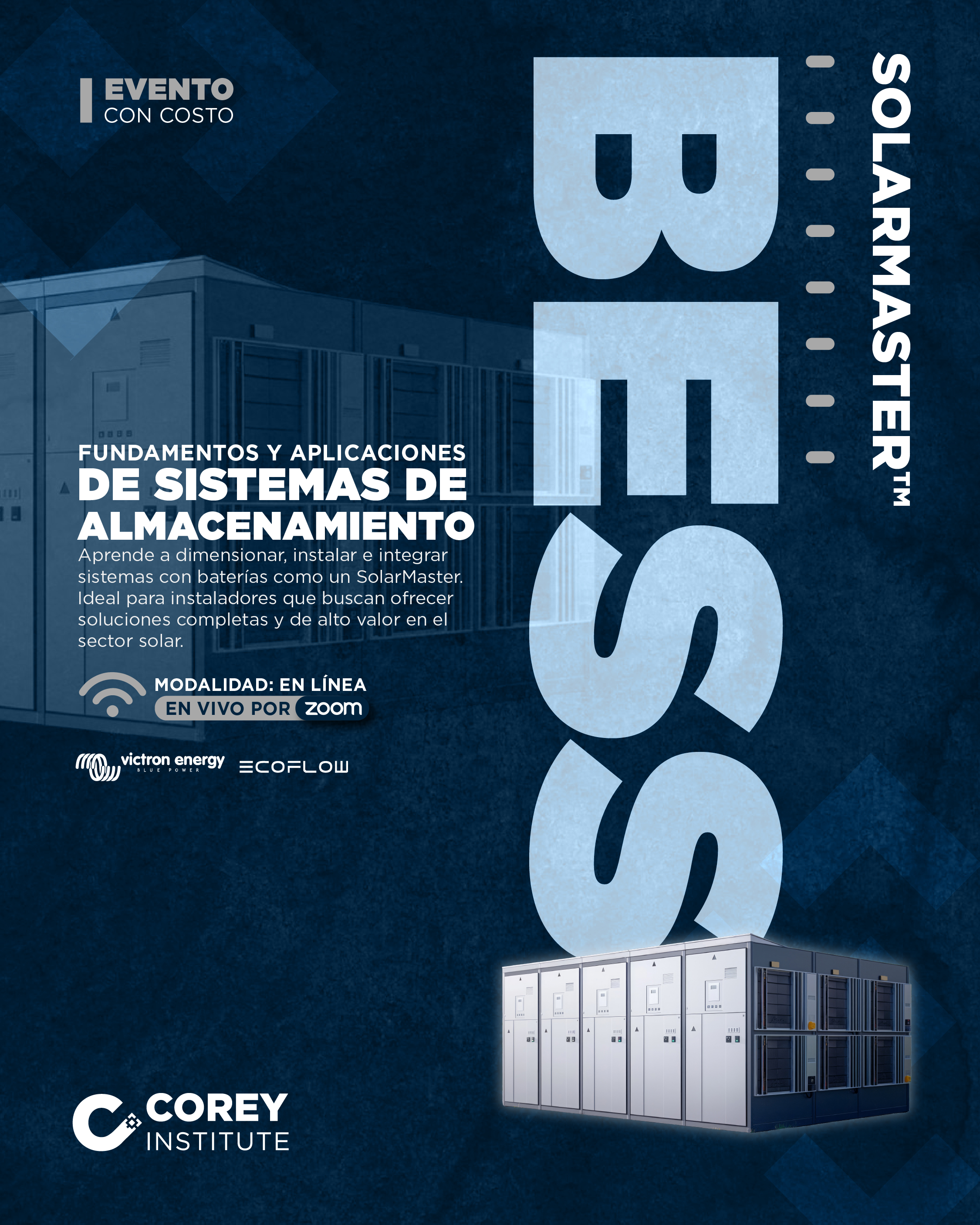 ¿Necesito experiencia previa? Con que entiendas conceptos básicos de solar es suficiente. ¿Incluye prácticas reales? Sí: ejercicios de dimensionamiento, simuladores y presentaciones con equipos Victron/Ecoflow. ¿Puedo ver las grabaciones después? Sí, quedan disponibles en Corey Institute. ¿Qué pasa si no puedo asistir en vivo? Puedes tomarlo después completo con las grabaciones. ¿Puedo facturar? Sí, se factura con IVA incluido.